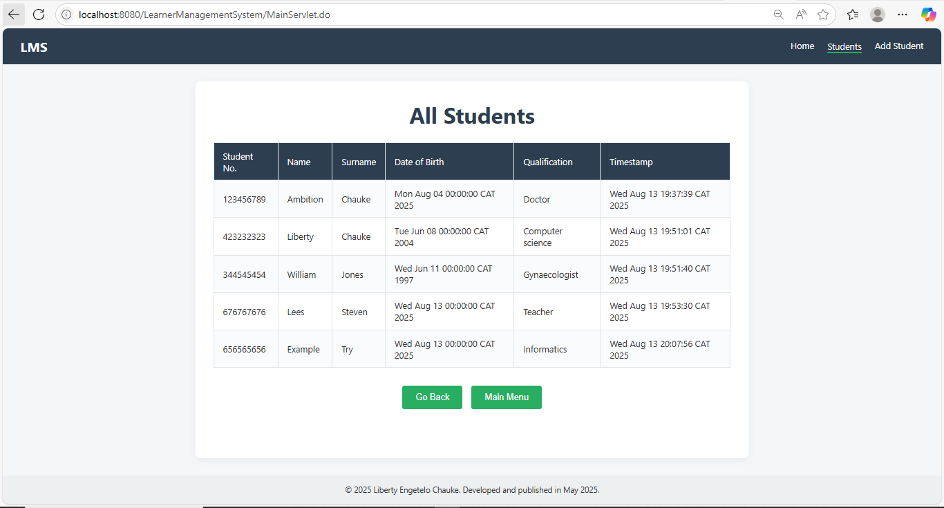 jdbc/LearnerDS) and match in persistence.xml.http://localhost:8080/LearnerManagementSystem/ to view the LMS as in the screenshots.Click any image to view it larger. Use Esc or click outside to close.